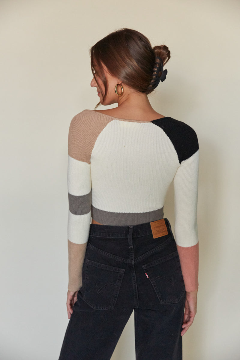 The Carina Long Sleeve Colorblock Sweater is a seasonal favorite! This trendy knit top features a colorblock design, square neckline, long sleeves, and a cropped hem. Pair with the to complete the look!