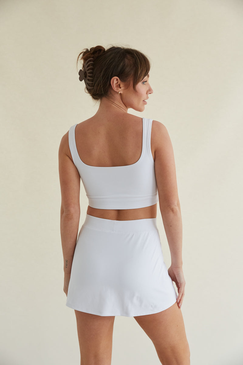 Stay comfortable and chic in the Nina Smoothing Tennis Skort! This trendy tennis skort features butter-soft, smoothing fabric with four-way stretch, a simple A-line silhouette, mini side slit, thick elastic waist band, and lifting built in shorts with pockets. Available in , white, and . Pair with the to complete the set!