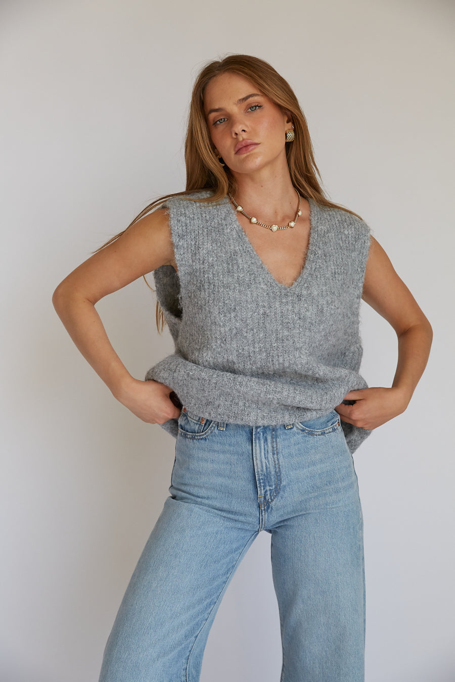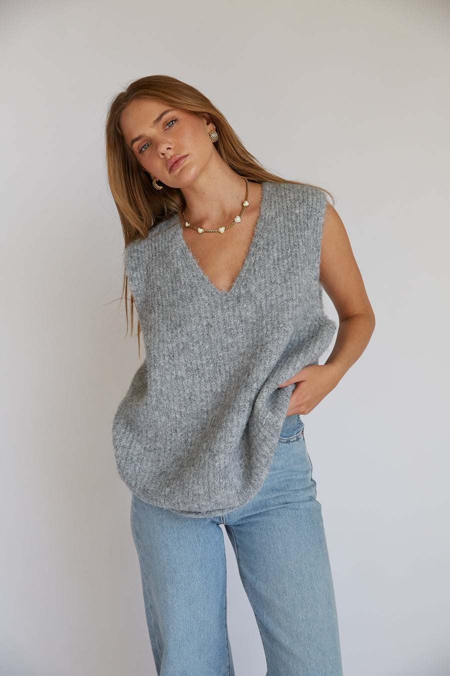 Channel your inner cool girl in the Spencer Wool Sweater Vest! This sleeveless vest features a high quality wool fabrication, baggy fit, and v neckline. Available in Grey; style with your go-to to complete the look!